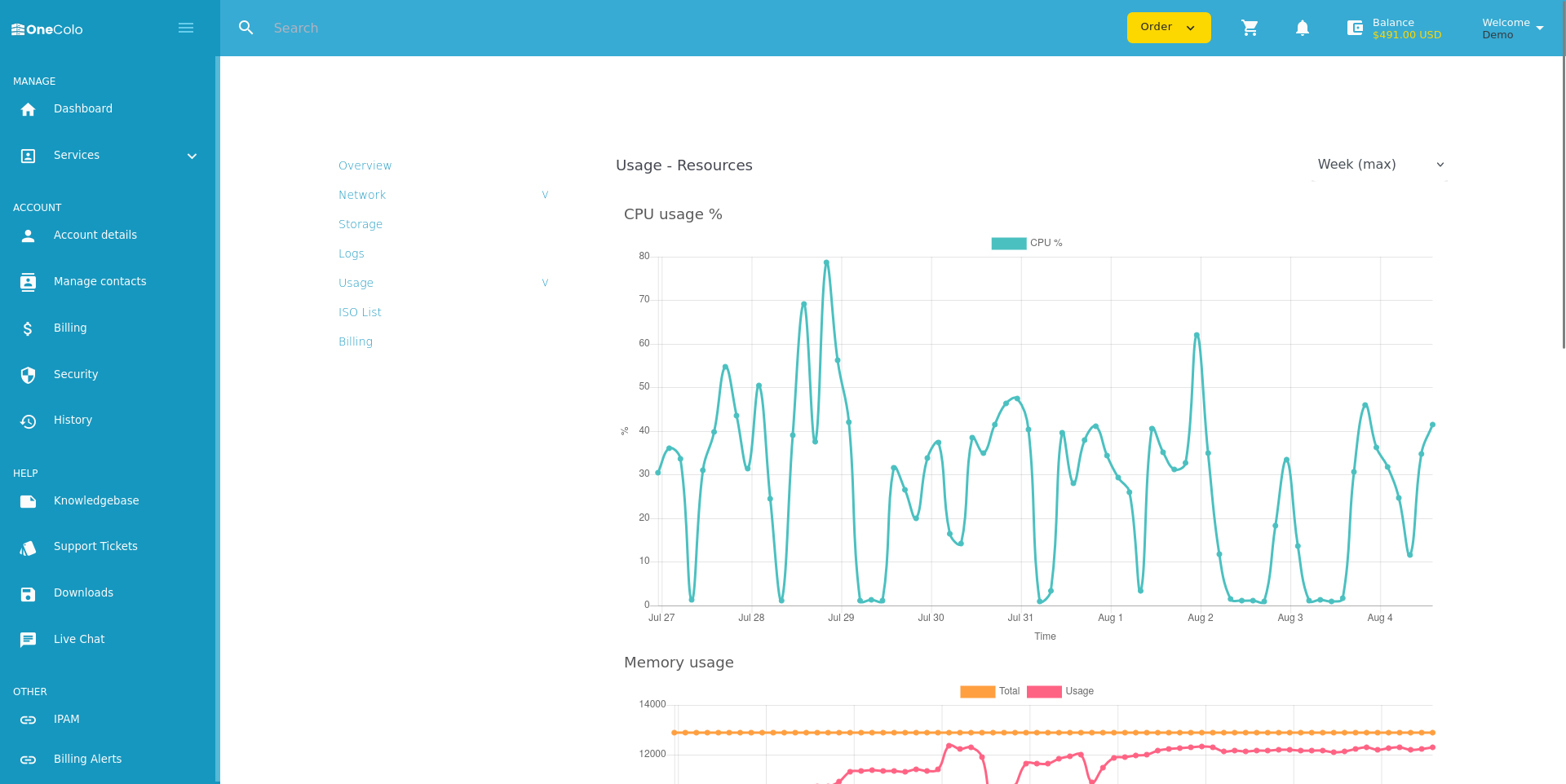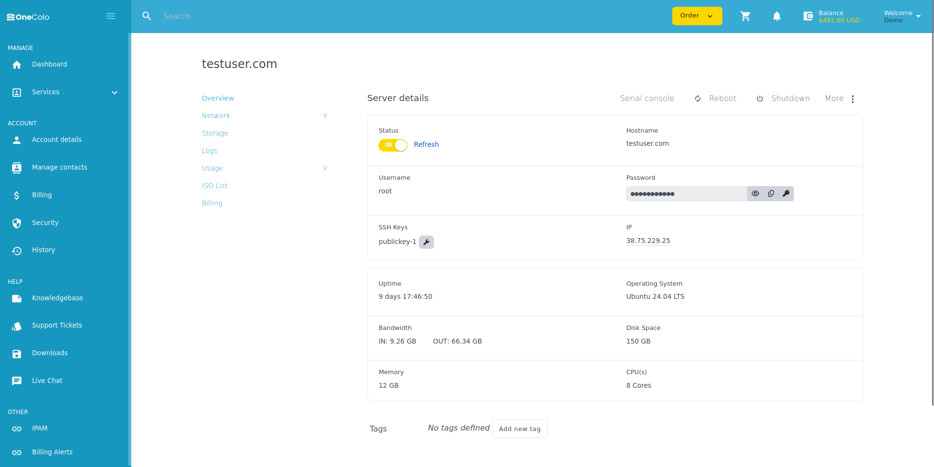 OneColo’s control panel offers streamlined management for virtual machines (VMs), virtual private servers (VPSs), and dedicated servers. Users can deploy, reboot, reinstall, or shut down VMs and VPSs with just a few clicks, while monitoring real-time performance metrics like CPU, RAM, and bandwidth usage. Snapshots and backups are easily accessible, giving customers the flexibility to restore or duplicate instances as needed. The panel also includes ISO mounting, console access, and network configuration tools to give users full control over their environments.